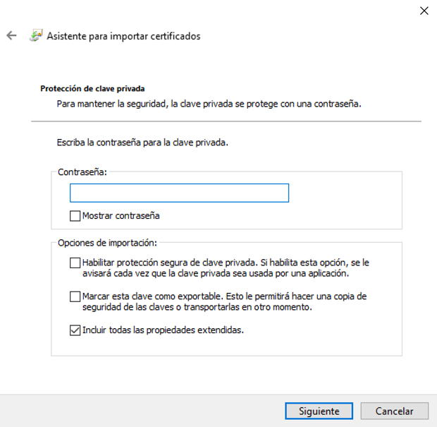 Al margen de la clave que viene con el archivo, el asistente te pide que fijes una contraseñade uso para proteger tu certificado. Basta con escribirla en el cajón de texto que aparece en la ventana y pulsar sobre Siguiente.