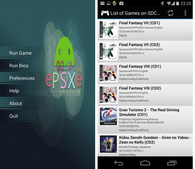 El tema con los juegos es simple: el emulador necesita el archivo en ISO o BIN para poder ejecutarlo. La letra pequeña dice que deberás ser dueño del juego para poder ejecutarlo en emulador, y en caso que tengas juegos de PlayStation podrás ripearlos en tu PC con ImgBurn (seleccionando la velocidad más baja) para luego transferirlos a tu teléfono por medio de un cable USB.