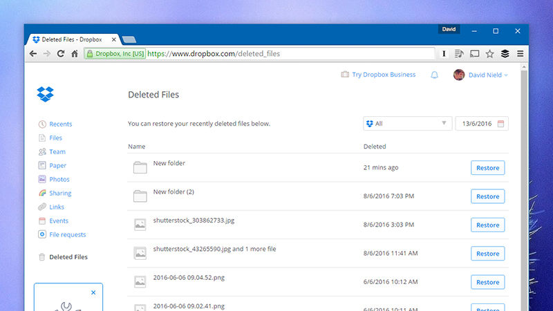 En el caso de aplicaciones como Dropbox, por ejemplo, puedes cargar la interfaz web e ir a la pestaña de Archivos eliminados para ver una lista de documentos y carpetas borrados recientemente. Haz clic en Restaurar junto a cualquier ítem para traerlo de vuelta. Los archivos borrados se guardan durante 30 días o un año si te has registrado en Dropbox Pro y tienes el complemento del historial de versiones ampliado.