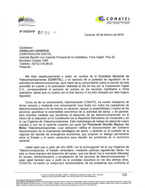Conatel exhortó, a través de un comunicado, dirigido al representante de la compañía Oswaldo Cisneros suspender inmediatamente el alza de las tarifas hasta que se realice un informe sobre las razones de la medida.