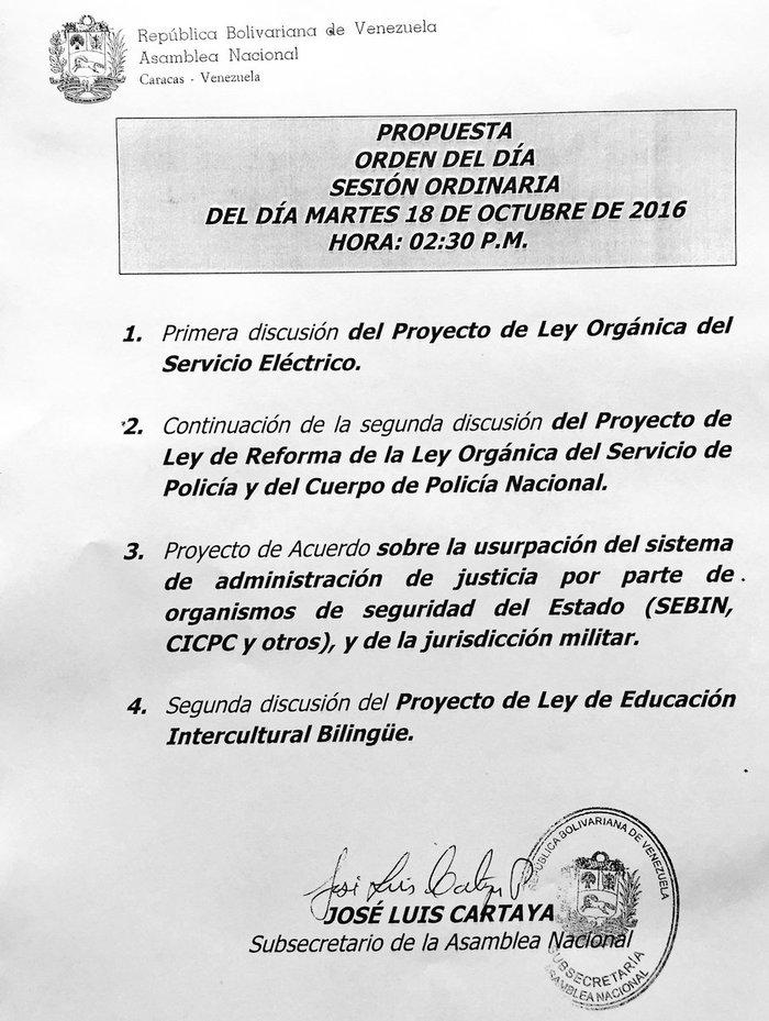 La Asamblea Nacional (AN) publicó el orden del día para la sesión ordinaria que tendrá lugar este martes, a partir de las 2:30 de la tarde.