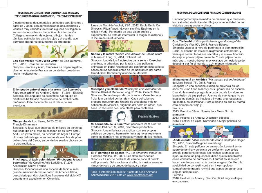 La Fiesta de cine animado Animandino 2015, es un evento patrocinado por el Institut Français en sociedad con la Asociación Francesa de Cine Animado AFCA, y a escala nacional por la Embajada de Francia, la Alianza francesa y la Asociación Nacional de Autores Cinematográficos ANAC.
