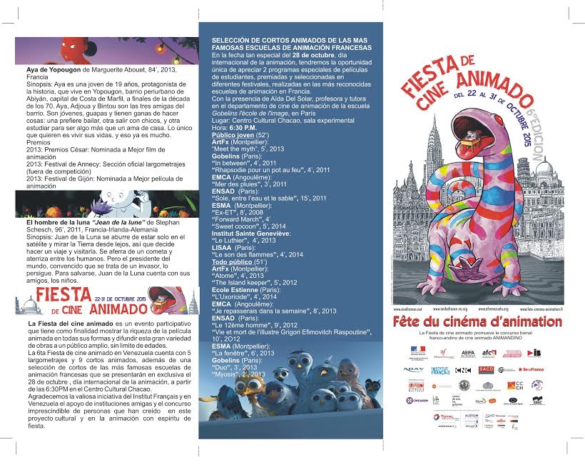El miércoles 28 de octubre, a las 7:00 p.m., Día Internacional de la Animación, y en el marco de la celebración de la 6ta. Edición del Festival Animandino 2015, con la presencia de Aïda Del Solar, profesora de la escuela Gobelins l’école de l’image (París), se podrán apreciar, en la Sala Experimental del Centro Cultural Chacao, cortometrajes de estudiantes premiados y seleccionados en diferentes festivales, realizadas en las más reconocidas escuelas de animación en Francia. Entrada libre.