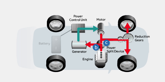 Por el contrario, circular a velocidad de crucero es una operación de alta eficiencia de combustible para el motor de gasolina, y por ello el sistema lo utiliza en este caso como fuente principal para propulsar el coche. Se pone en marcha el generador para reciclar la energía cinética y transformarla en electricidad. La corriente se emplea para alimentar el motor eléctrico a través de la unidad de control de potencia.