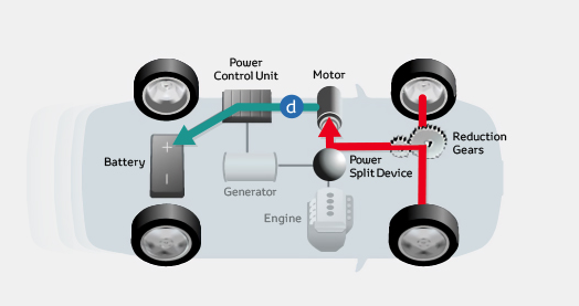 Para obtener la energía que necesitan, durante la deceleración y el frenado son las ruedas las que proporcionan tracción al motor, de manera que el flujo de energía se invierte: las ruedas alimentan el motor eléctrico, que canaliza la energía a través de la unidad de control de potencia para recargar la batería.