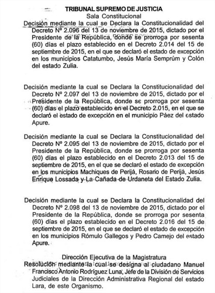 egún la información reseñada por la Gaceta Oficial número 40.805, la Sala Constitucional del Tribual Supremo de Justicia (TSJ) declara la constitucionalidad del decreto 2.096 emitido por el presidente de la República, Nicolás Maduro en el que se prorroga el estado de excepción por 60 días en los estados Zulia y Apure.