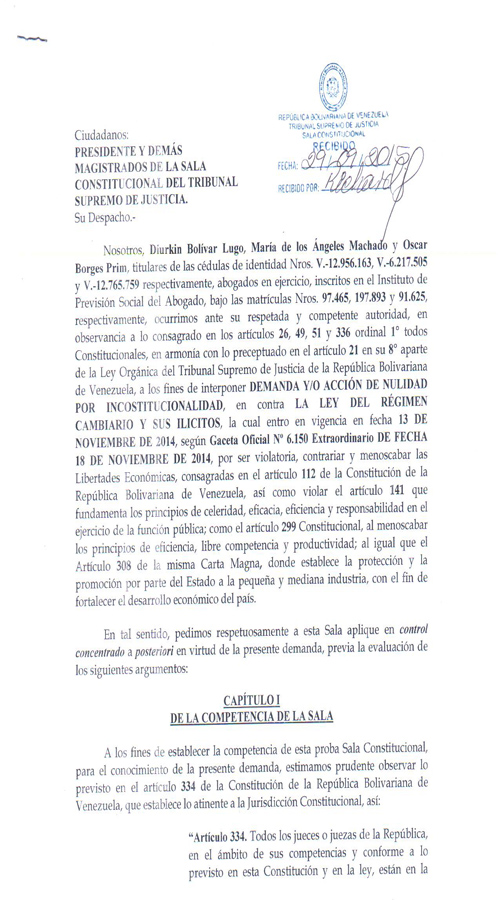 El despacho de abogados Borges Prim y Asociados interpuso una demanda ante la Sala Constitucional del Tribunal Supremo de Justicia por la inconstitucionalidad de la ley sobre el régimen cambiario y sus ilícitos. Lo anterior en vista que la referida ley, viola las libertades económicas consagradas en el artículo 112 de la Constitución Nacional de la República Bolivariana de Venezuela, los principios que deben regir la función de la administración pública, consagrado en el artículo 141, así como los principios que deben regir el sistema socio económico venezolano, consagrado en el artículo 299 ambos Constitucionales.