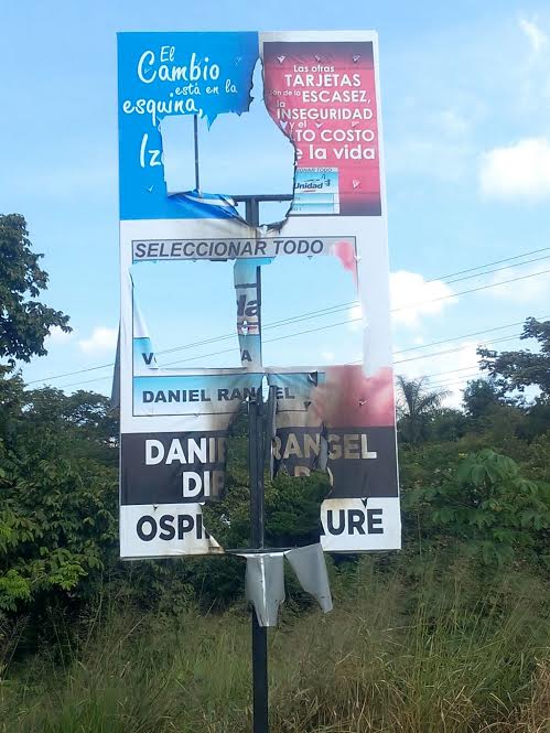 El jefe de campaña del Comando Venezuela Unida del municipio Ospino (Portuguesa), Derwing Torres, denunció que durante la madrugada de este jueves, afectos al oficialismo quemaron vallas publicitarias de la MUD ubicadas en el sector La Encrucijada de la troncal 5, que respaldan la candidatura de Daniel Rangel a la Asamblea Nacional.
