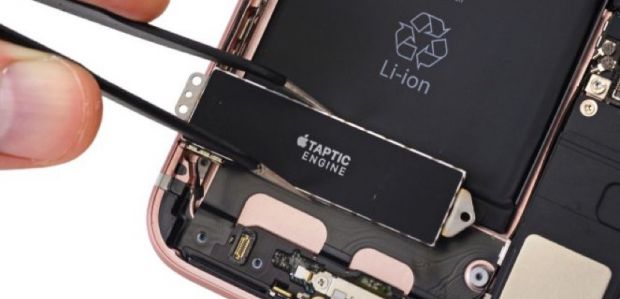 Quizás el aspecto que había más ganas a descubrir era cómo han usado ese espacio que queda libre tras suprimir el conector de auriculares minijack: el nuevo motor háptico. El motor háptico ocupa una parte considerable de la zona inferior del teléfono y permite emitir distintas vibraciones adaptadas a la experiencia de uso del teléfono, haciendo que la vibración tenga más sentido y, en definitiva, sea más realista. La parte inferior izquierda, que parece un altavoz, en realidad es un pieza de plástico usada para aislar el agua taponando la rejilla, y también para conducir el sonido hacia el micrófono.