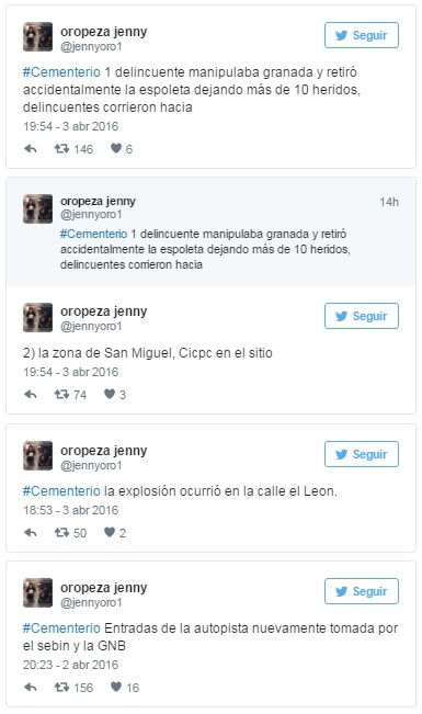 A través de red social twitter la periodista Jenny Oropeza informó sobre un intercambio de disparos con detonación de una granada que tuvo lugar en la calle El León de El Cementerio, durante la tarde de este domingo.