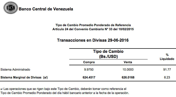 En comparación con el cierre de la jornada anterior (Bs. 625,88), subió 0,13 bolívares. Según el Banco Central de Venezuela (BCV) fueron asignadas a esta modalidad de cambio el 8,23% de las divisas, la mayor hasta la fecha, mientras que el 91,77% restante se cotizó a 10 (diez) bolívares. En su promedio semanal Dicom registró Bs. 610,57 por dólar en la semana del lunes 20 al jueves 23 de junio de 2016, tomando en cuenta que el viernes 24 no hubo cierre por ser feriado nacional.