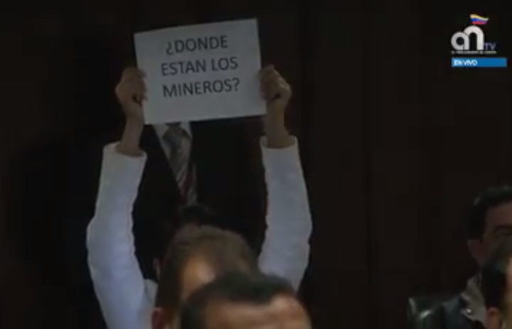 Durante el debate sobre la denuncia por la desaparición de los 28 mineros en la mina Athenas del municipio Temeremo, del estado Bolívar, diputados de la MUD mostraron carteles en lo que preguntaban dónde están los ciudadanos que se presumen estén muertos.