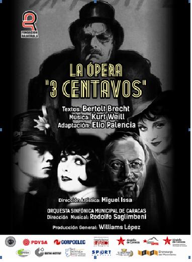 La Opera de Tres centavos es una obra de teatro épico o teatro dialéctico, es un tipo de teatro que se diferencia del teatro clásico en su función social y su tono político que se desarrolla y se transforma en un sub-género teatral a través de la obra. Es una crítica a la deformación de los valores humanos. Desafía las convencionales nociones de propiedad así como las del teatro. Dramatiza la pregunta: «¿Quién es un criminal mayor? ¿El que roba un banco o el que funda uno?» La Opera 3 centavos es también un temprano ejemplo del moderno género de la comedia musical. La creación y producción de esta obra teatral estará a cargo de una de las agrupaciones teatrales de mayor trayectoria del país, acompañada por la Orquesta Sinfónica Municipal de Caracas, bajo la dirección musical del maestro Rodolfo Saglimbeni e interpretada por un elenco de más de 40 actores y actrices (Entre ellos destacándose Domingo Balducci, Fabiola Arace, Adolfo Nittoli, Diana Peñalver, Wilfredo Cisneros, Simona Chirinos, Pedro Pineda, Francisco Díaz, Adriana Bustamante). El concepto artístico fusiona elementos de la danza el teatro y la música enmarcada en la línea de trabajo que ha venido desarrollando Miguel Issa desde hace más de 25 años.