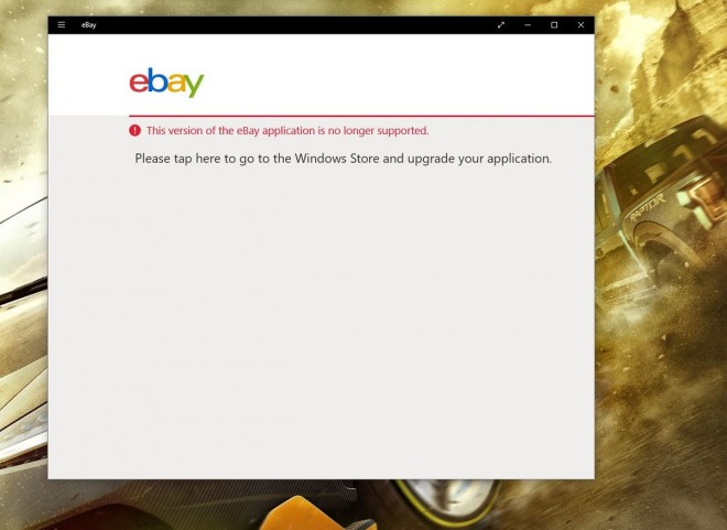El 30 de septiembre eBay anunció la descontinuación de su aplicación, según informa Windows Central. Sin embargo, ésta seguía permitiendo el acceso a todas sus funciones, como buscar productos, realizar compras, enviar mensajes, etcétera.