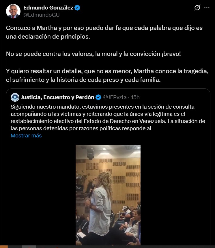 «Conozco a Martha y por eso puedo dar fe que cada palabra que dijo es una declaración de principios», escribió González Urrutia en un mensaje publicado en su cuenta de la red social X.