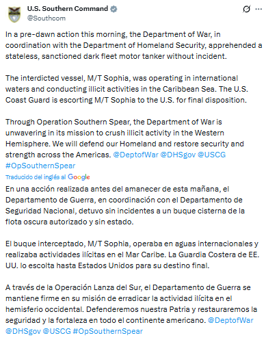 El M/T Sophia fue detectado por los sistemas de vigilancia avanzada de la Operación Lanza del Sur, la masiva ofensiva aérea y naval que Washington mantiene en la región desde septiembre. Según el reporte oficial emitido por el Comando Sur a través de su cuenta en X: