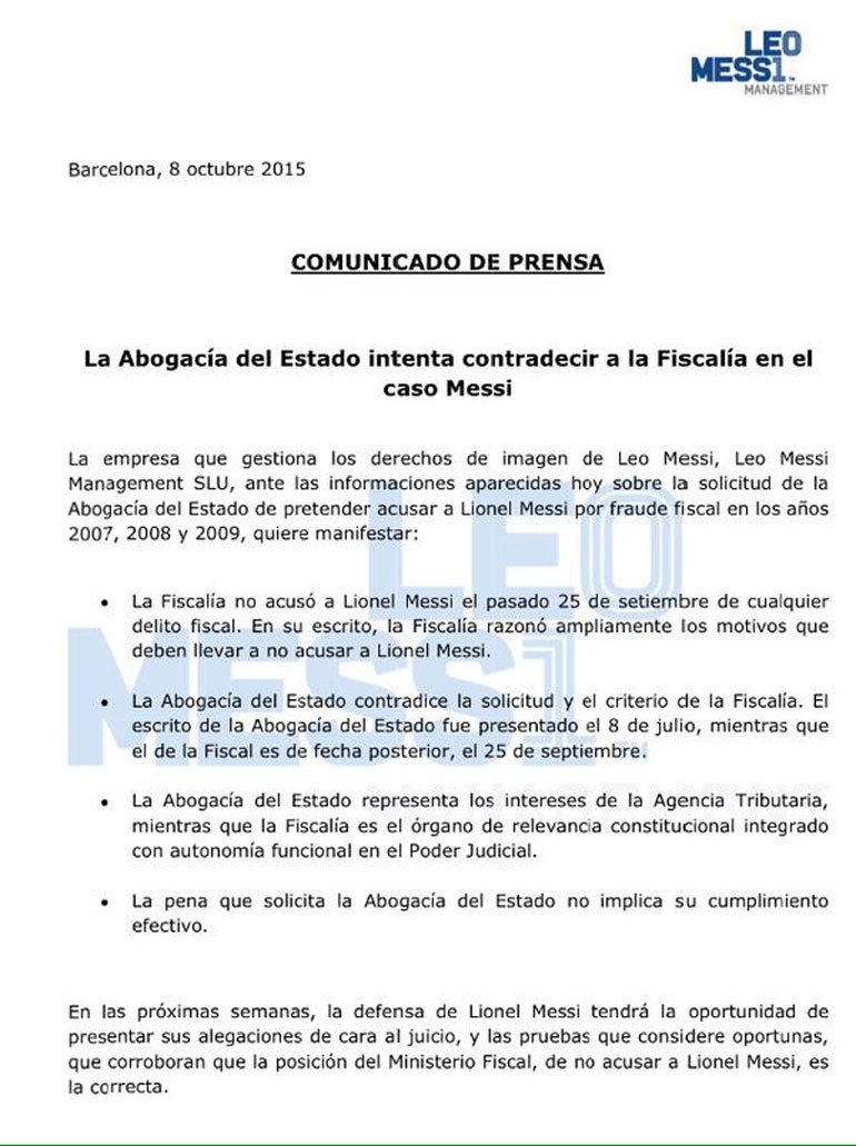 A través de un comunicado de Leo Messsi Management SLU, la empresa que gestiona los derechos de imagen del futbolista argentino, le resta importancia a la petición de prisión y se remite a la resolución de la Fiscalía del 25 de septiembre pasado en la que no se acusa a Messi de ningún delito fiscal.