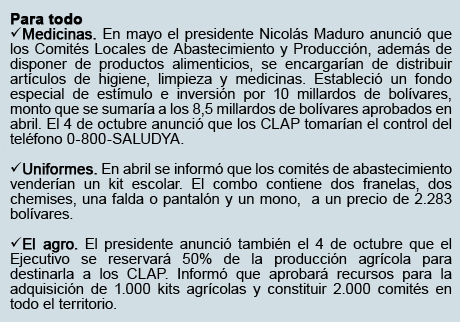 A comienzos de septiembre Maduro anunció que 14.000 CLAP operaban en Venezuela y que la meta era llegar a 21.000 para finales del presente año. El mecanismo fue creado el 20 de abril de 2016.