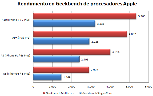La cosa se pone aún más interesante cuando comenzamos a hablar de rendimiento. Las primeras pruebas que han aparecido en Geekbench revelan que el procesador Apple A10 es claramente más potente que sus antecesores: su rendimiento es según Apple el doble que el A8 y un 40% superior al del A9, y las cifras de Geekbench parecen confirmarlo.