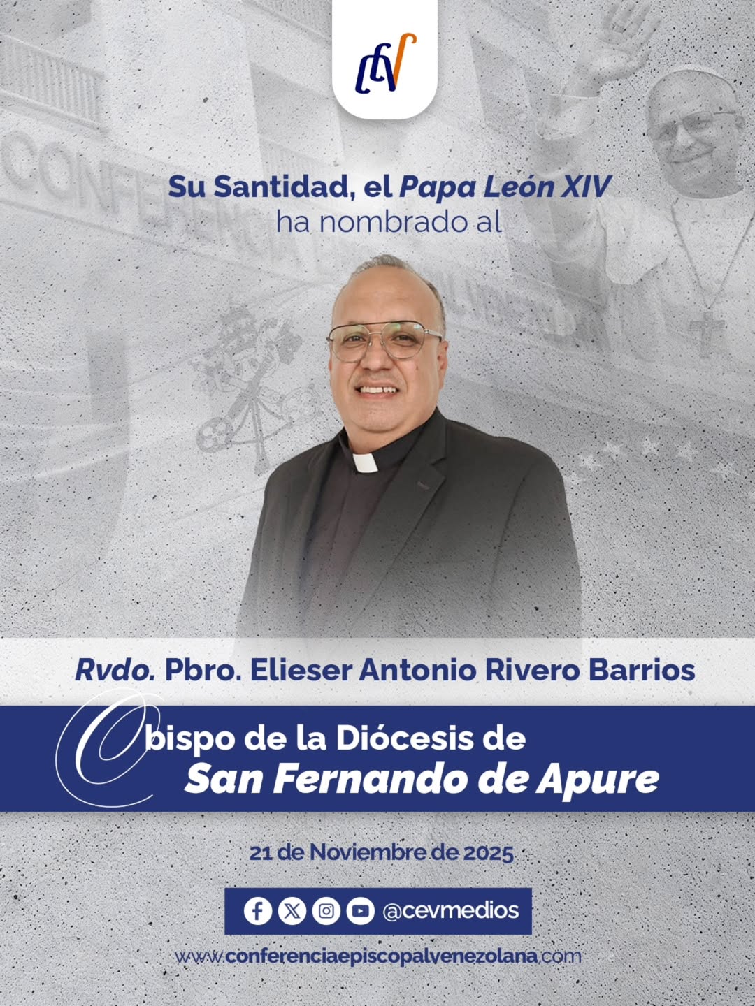 El papa León XIV nombró como Obispo de la Diócesis de San Fernando de Apure al reverendo Elieser Antonio Ribero Barrios, miembro del clero de la Diócesis de San Felipe, según lo confirmó este viernes la Conferencia Epilcopal Venezolana a través de sus redes sociales.