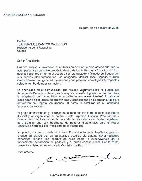 En una misiva difundida en su cuenta de Twitter, Pastrana, que gobernó Colombia entre 1998 y 2002, se refirió al acuerdo sobre justicia transicional anunciado el pasado 23 de septiembre por el Gobierno y las FARC en Cuba, del que dijo que «plantea complejos interrogantes sobre el rumbo» del país.