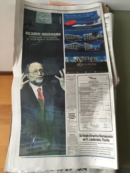 Los abogados penalistas José Amalio Graterol y Thelma Fernández como apoderados judiciales del economista y catedrático de Harvard Ricardo Hausmann, manifestaron su repudio a la publicación realizada por el periódico El Universal en su edición 37.217, cuerpo 1, página 16, de fecha 14 de noviembre de 2015, en la cual se pudo ver media página a todo color con la imagen de Ricardo Hausmann en donde se le señala de “Delincuente, hambreador de los paquetes neoliberales”.