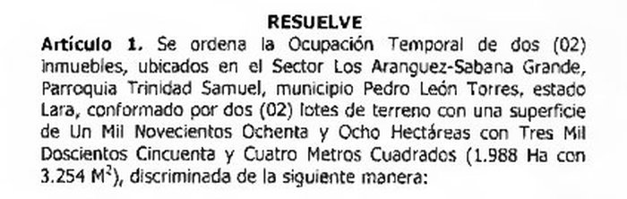 Por medio de la Resolución N° 044 del Ministerio de Vivienda y Hábitat, publicada en la Gaceta Oficial 40.865, el Gobierno nacional decidió ocupar temporalmente 2 lotes de terreno en el estado Lara.