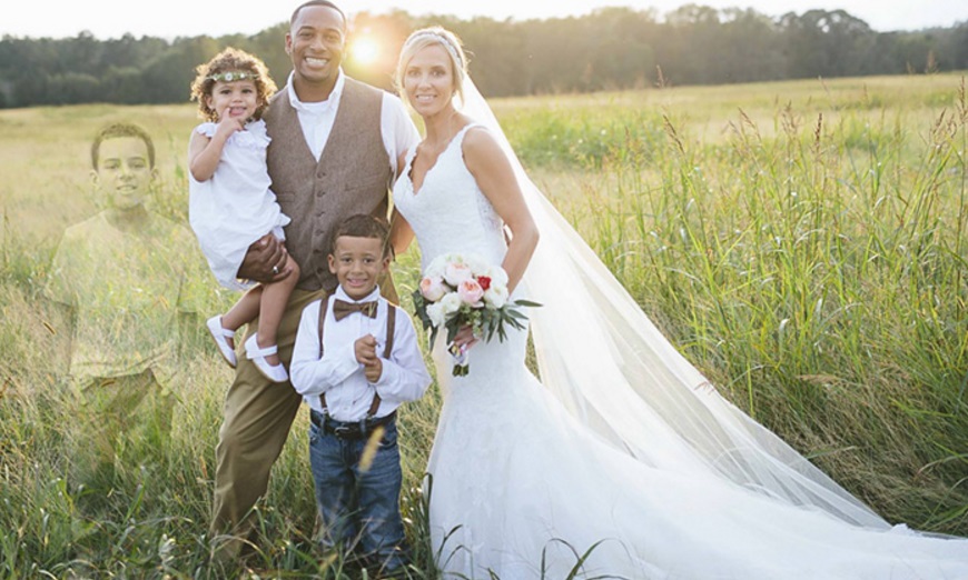 Anna Thompson que perdió a su hijo mayor tras una larga lucha contra la leucemia, se aseguró de que su fallecido hijo formará parte del día de su boda.Para honrar su memoria, Thompson trabajó junto con su amigo y fotógrafoBrandy Ángel para incorporarlo en la fotografía familiar.