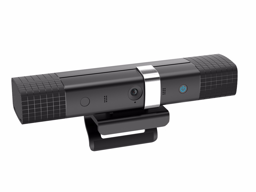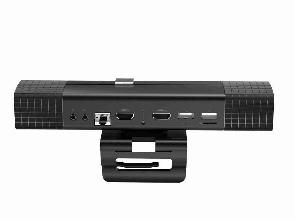 Sus dimensiones son de 220 x 48 x 36 milímetros y en el exterior nos encontramos con una cámara central Full HD (1080p, 30fps) con lente gran angular, dos altavoces frontales y dos micrófonos, lo que lo hace ideal para conferencias en vídeo.