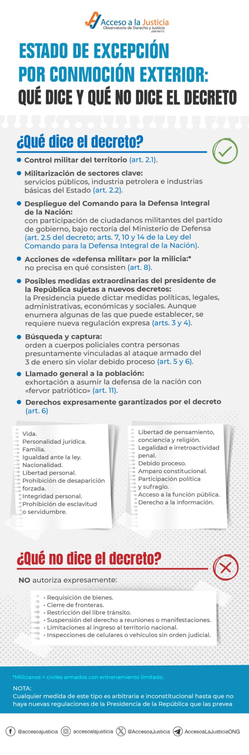 Un nuevo decreto de estado de excepción establece cambios significativos en la organización del territorio y la seguridad nacional. Entre sus principales disposiciones, centraliza el control bajo mando militar, integra a la milicia en tareas de defensa y habilita al Ejecutivo para dictar futuras medidas extraordinarias.