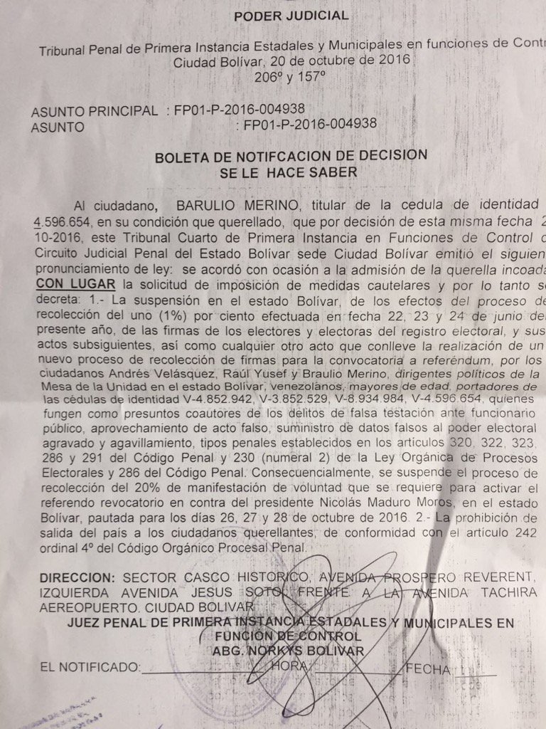 Así mismo, impide al dirigente nacional de La Causa R, Andrés Velásquez, al coordinador del Comando Bolívar, Raúl Yusef, al miembro de la junta de dirección regional de Primero Justicia en el estado Bolívar Braulio Merino y a dirigentes de la Unidad Democrática en esa entidad una nueva recolección de rúbricas.