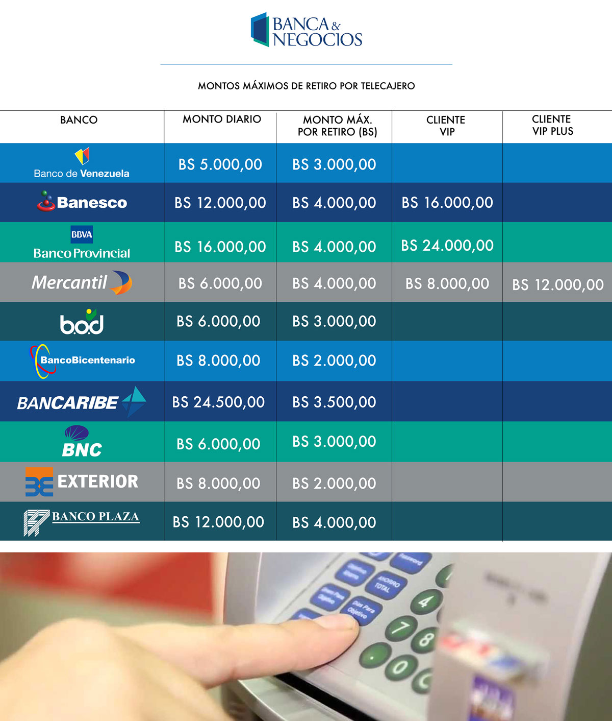 Actualmente, de acuerdo con un sondeo realizado por BancayNegocios.com entre algunos bancos del mercado local, los límites para retiros diarios van desde un máximo de 2.000 bolívares por retiro y un tope diario de 5.000 hasta un máximo de Bs. 4.000 por retiro y un techo de 24.500 por día.