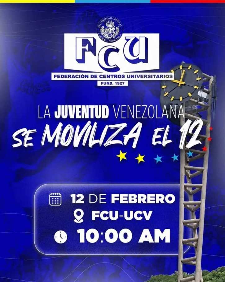 La Federación de Centros Universitarios de la Universidad Central de Venezuela (FCU-UCV) convocó este martes a una movilización para este próximo 12 de febrero, cuando se conmemora el Día de la Juventud en Venezuela.
