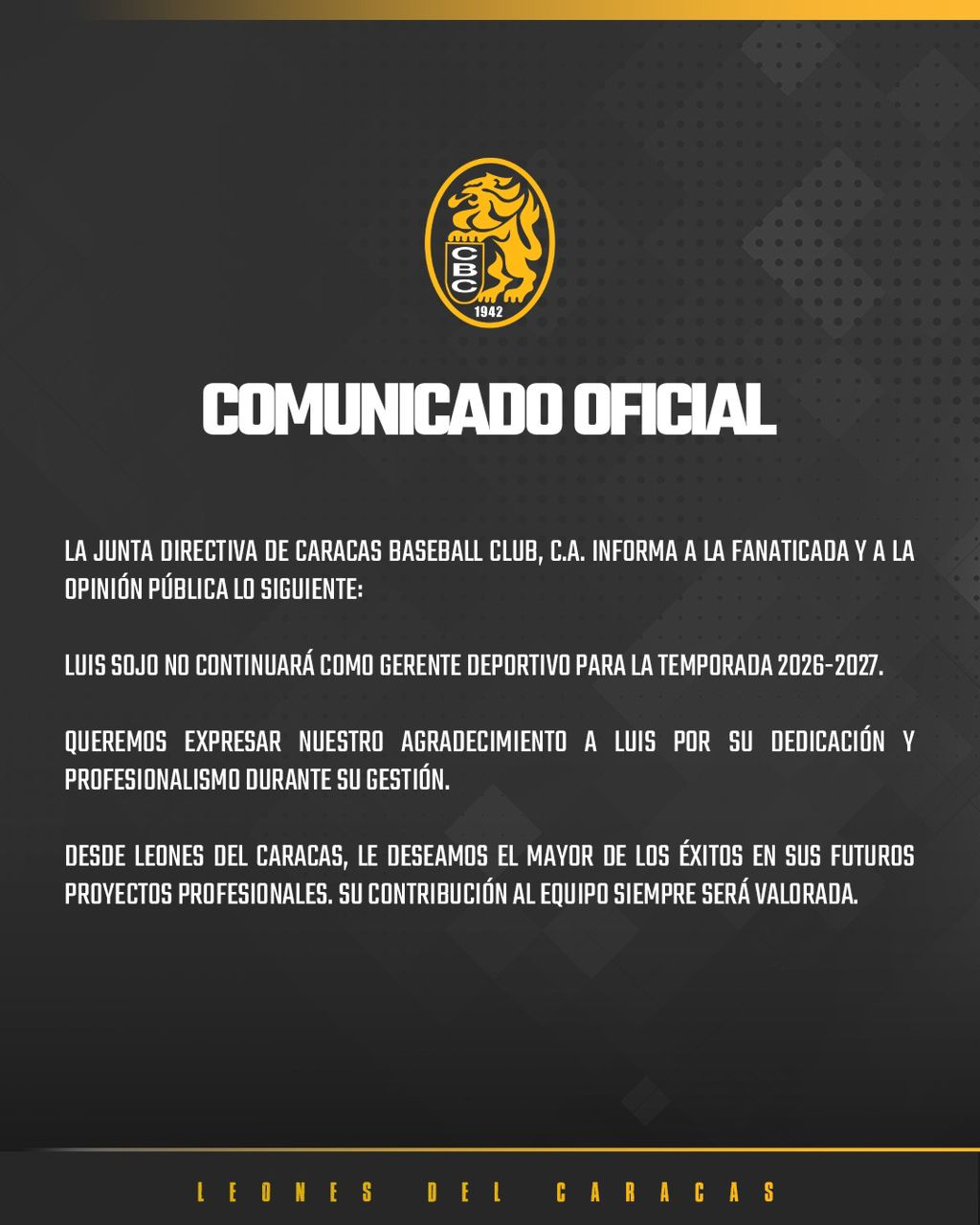 Lo que miles de fanáticos exigían a gritos en las tribunas y redes sociales finalmente es una realidad: Luis Sojo no seguirá al frente de la Gerencia Deportiva de los Leones del Caracas para la temporada 2026-2027. La Junta Directiva del club capitalino hizo oficial el anuncio este viernes, cerrando así uno de los capítulos más cuestionados en la historia reciente de la organización.