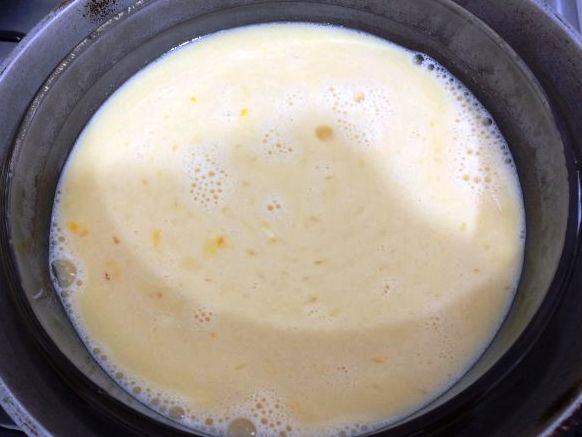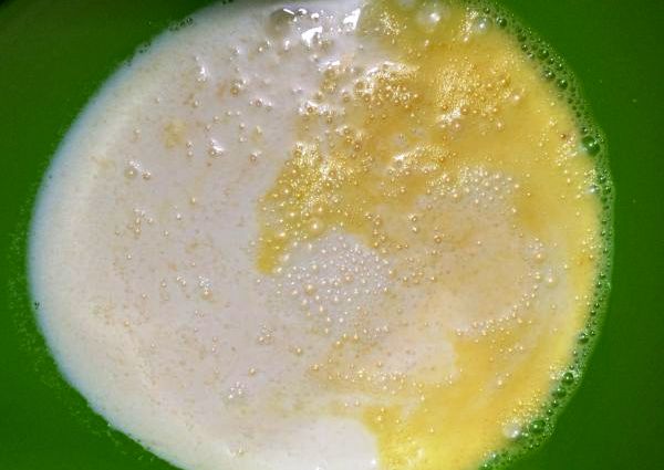 Agregar la leche y el zumo de naranja, mezclar hasta integrar todo.