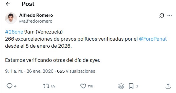 «9:00 am (Venezuela): 266 excarcelaciones de presos políticos verificadas por el Foro Penal desde el 8 de enero de 2026», detalló Romero, subrayando que la lista sigue en proceso de validación.