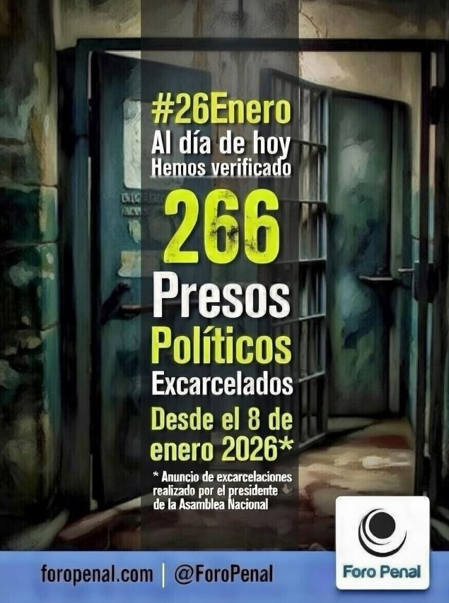 La organización no gubernamental Foro Penal actualizó la mañana de este lunes 26 de enero el balance de las liberaciones de presos políticos en el país. Según el último reporte, se han verificado 266 nuevas excarcelaciones en las últimas horas, cumpliendo con parte del proceso anunciado a principios de mes.