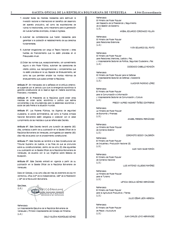 El Artículo 3 de la norma subraya la magnitud de la emergencia, señalando que «sin menoscabo de lo señalado en el artículo anterior, se suspende por el periodo que dure la emergencia económica la garantía constitucional de la reserva legal en materia económica, financiera y monetaria».