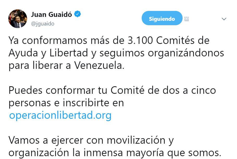 A través de su cuenta de Twitter, Guaidó comentó: “Ya conformamos más de 3.100 Comités de Ayuda y Libertad y seguimos organizándonos para liberar a Venezuela”.