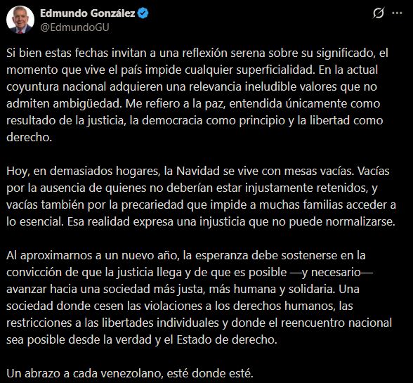 El líder opositor de Venezuela, Edmundo González Urrutia, difundió este miércoles un mensaje con motivo de la Navidad en el que llamó a la reflexión sobre la crisis que atraviesa el país y advirtió que las circunstancias actuales impiden vivir estas fechas con superficialidad, debido a las injusticias que afectan a miles de familias venezolanas.