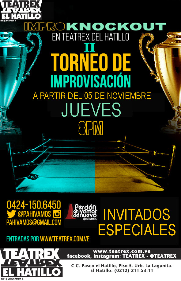 La invitación es para disfrutar de Improknockout todos los jueves de noviembre a las 8p.m en Teatrex El Hatillo. Las entradas están a la venta a través de www.teatrex.com.ve y el teléfono (0212) 211 53 05. Más información a través de las cuentas de Twitter e Instagram @pahivamos y @teatrex.