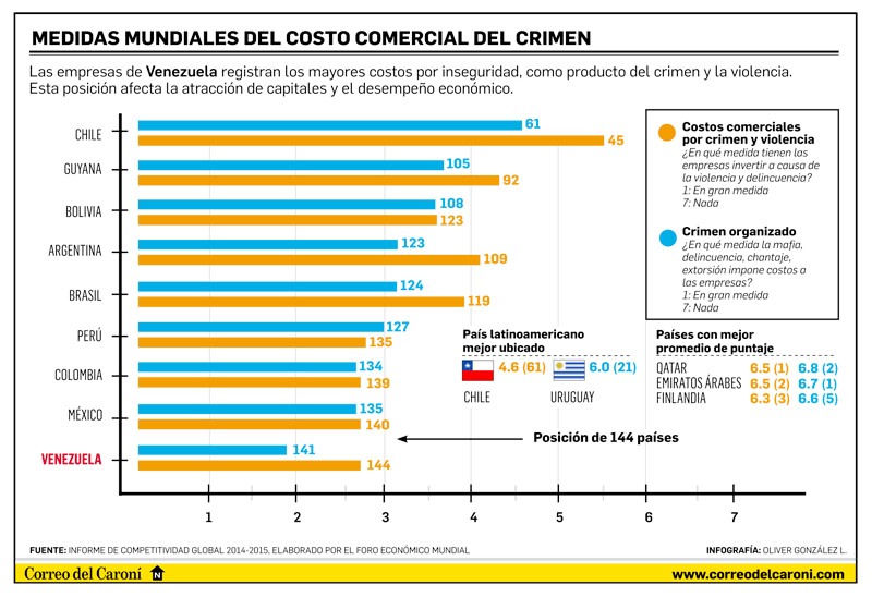 Ese auge delictivo que ha llevado al comercio a bajar sus santamarías muy temprano, como también ocurre en San Félix y sectores como Castillito y Unare, fue retratado en el Informe de Competitividad Global 2015, realizado por el Foro Económico Mundial, que ubicó a Venezuela en la posición 131 de 144 países estudiados en el ranking, lo que devela el ambiente poco propicio para hacer negocios en el país.