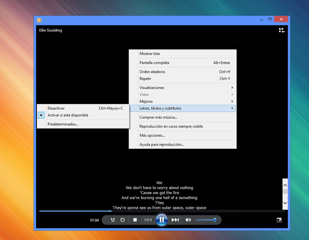 Haz doble clic sobre el archivo MP3 para comenzar a reproducirlo en el reproductor de Windows. A continuación, haz clic con el botón derecho del ratón sobre la ventana del reproductor y elige la opción Letras, títulos y subtítulos. Esta opción, en origen estará desactivada.