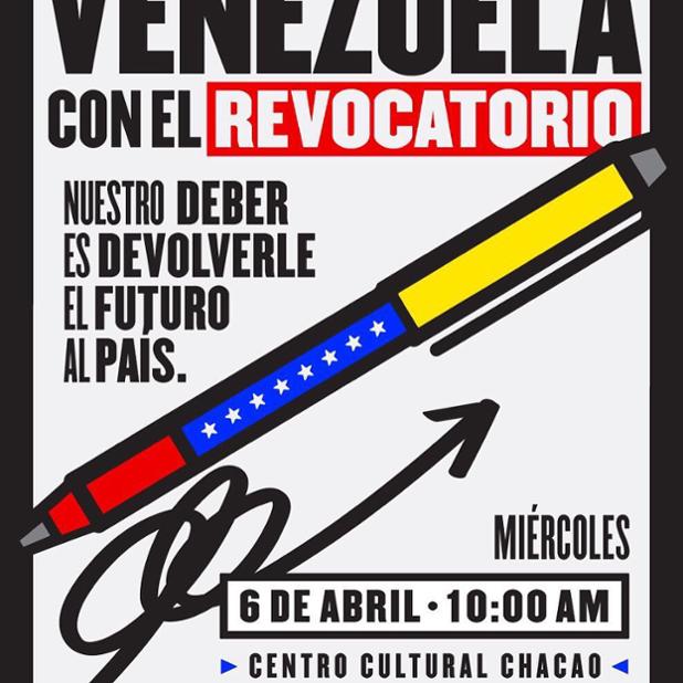 Desde las 10 de la mañana se inició el acto «Venezuela con el Revocatorio», en el Centro Cultural Chacao, iniciativa que cuenta con la participación del abogado Alberto Arteaga, el historiador Elías Pino Iturrieta, la dirigente estudiantil de la Universidad Central de Venezuela (UCV), Michelle Giraud, el escritor Leonardo Padrón, la periodista Valentina Quintero, el médico Rafael Orihuela y el humorista Laureano Márquez; la conducción estará a cargo del reconocido periodista y escritor César Miguel Rondón.