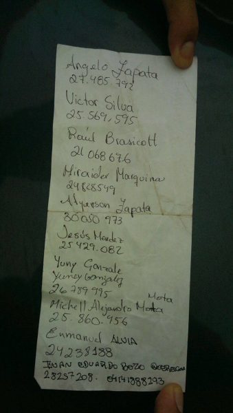 Los detenidos por la Guardia Nacional Bolivariana son: Angelo Zapata, Víctor Silva, Raúl Brasiocott, Miraider Marquina, Alyenson Zapata, Jesús Mendez, Yuney Gonzalez, Michell Mota.