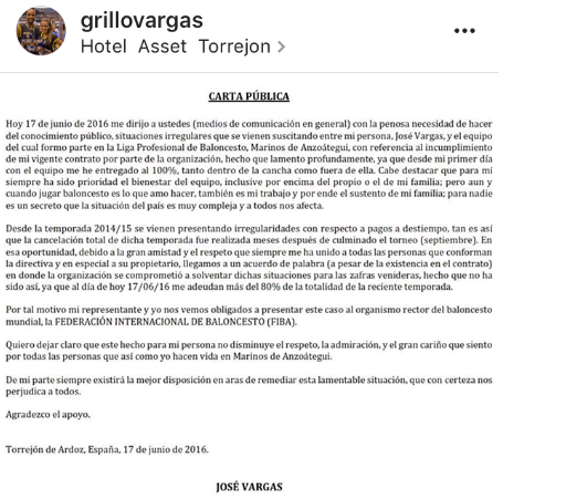 José “El Grillo” Vargas, jugador de la selección nacional de baloncesto, hizo pública a través de su red social Instagram, la situación referente al incumplimiento de su contrato con Marinos de Anzoátegui.