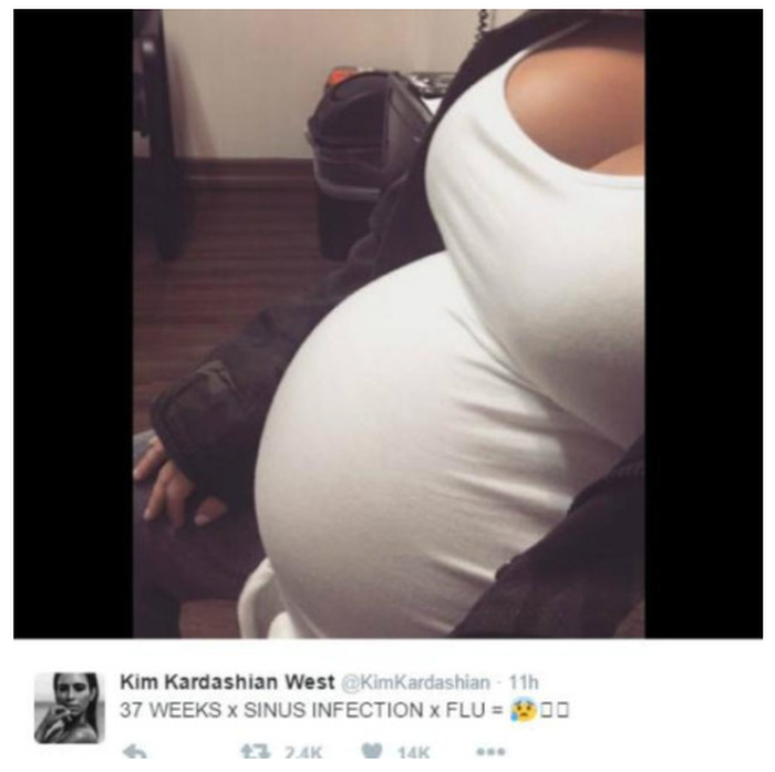 Kim ha publicado una fotografía de su barriga de embarazada en su cuenta de Twitter junto a un emoticono de una carita triste.