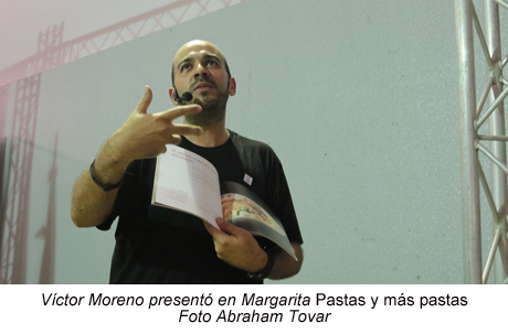 Una hora después comienza la presentación de Pastas y más pastasde Víctor Moreno (Libros El Nacional). El chef centra su discurso en vencer los prejuicios con respecto a la pasta. Hay que contextualizarla. En Venezuela, afirma, es justo que lleve sardinas o chipi chipi. En el recetario enseña a preparar fetuccini fosforera o ravioli de caraota con salsa de queso de cabra.