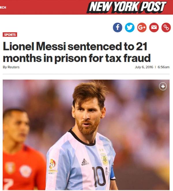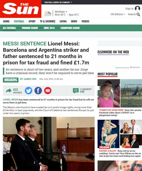 La noticia también se posicionó rápidamente en el encabezado de los portales de noticias más prestigiosos del mundo. «Lionel Messi, el delantero del Barcelona y la Argentina, sentenciado a 21 meses de prisión con su padre por un fraude fiscal y una multa de 1,7 millones de libras», informó el periódico inglés The Sun.