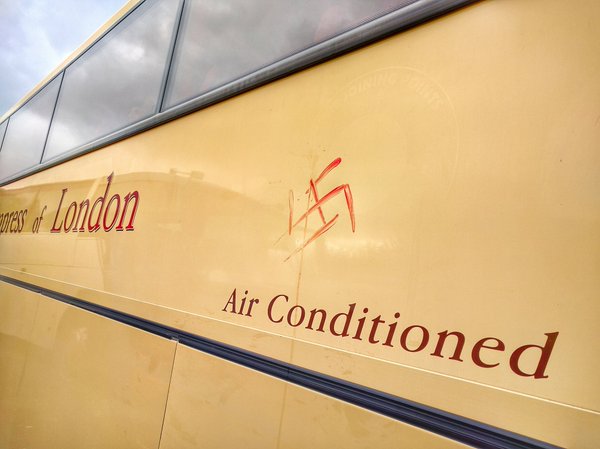 Un autobús que transportaba a un grupo de manifestantes anti racismo tenía pintada una esvástica con sangre, según un mensaje que un pasajero publicó en las redes sociales.